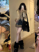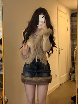 Washed Fur Paneled Denim Skirt for Women Retro Sexy Hot Girl High Waist A-line Skirt Y2k Skirt Fashion Casual Package Hip Skirt