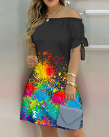 Women Striped Print Colorblock Off Shoulder Short Sleeve Street Daily Wear Summer Casual Dress Fashion