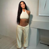 BOOFEENAA Kim K. White Fleece Fluffy 2 Piece Sets Womens Outfits Crop Top and Pants Joggers Casual Sexy Lounge Wear